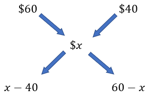 - Thus, after which we can write \(x=\frac{60\times 2a+40\times 3a}{2a+3a}\)